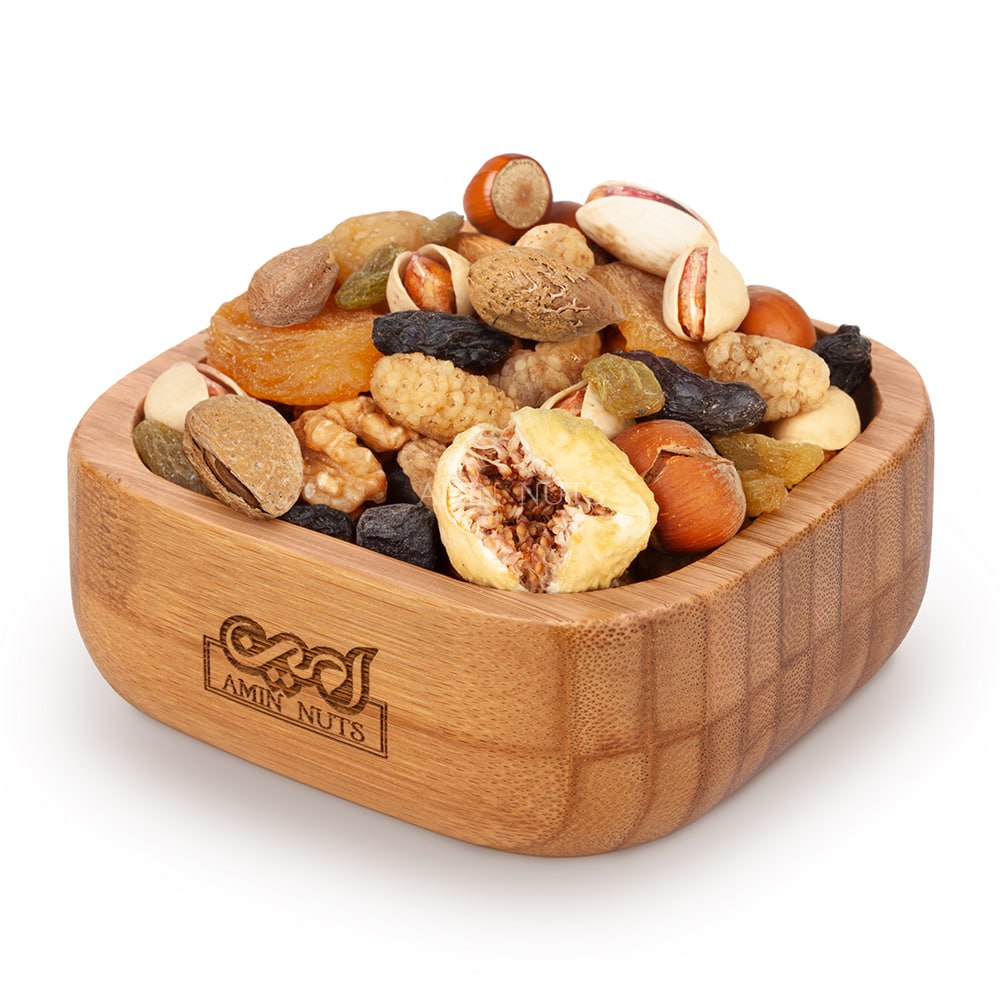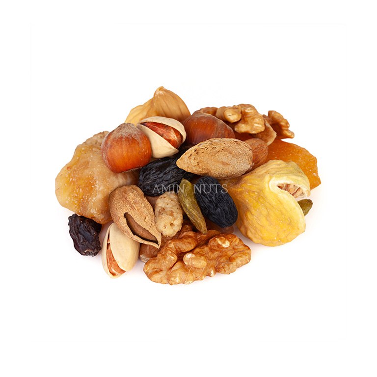 پسته احمدآقایی دست چین خام ۱۲% فندق ایرانی ۷% بادام منقا ایرانی ۷% انجیر خشک ۱۰% انجیر کردی ۱۰% مغز گردو خارجی ۷% توت خشک ۵% برگه زردآلو ۱۰% برگه هلو ۵% کشمش سبز ۱۵% مویز ۱۲%
